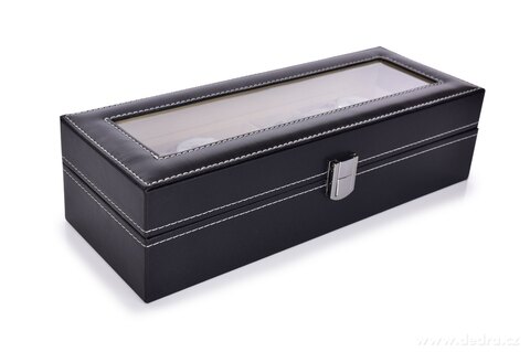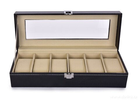 Luxusní kazeta EXCLUSIVE na 6 hodinek a náramků v koženém designu. Elegantní vitrínka s vyjímatelnými polštářky, sametovým vnitřkem a skleněným víkem. Stylové a bezpečné uložení pro pány i dámy.