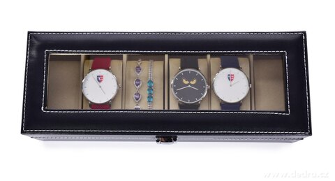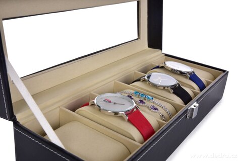 Dopřej svým hodinkám a šperkům místo, které si zaslouží. EXCLUSIVE kazeta na hodinky a náramky kombinuje luxusní vzhled, praktičnost a ochranu v jednom. Nabízí 6 přihrádek s měkkými polštářky, na které snadno uložíš hodinky, náramky i řetízky.