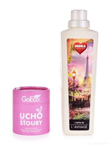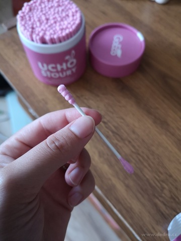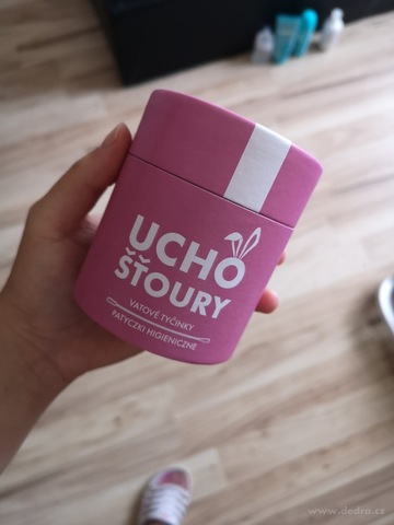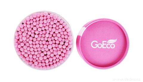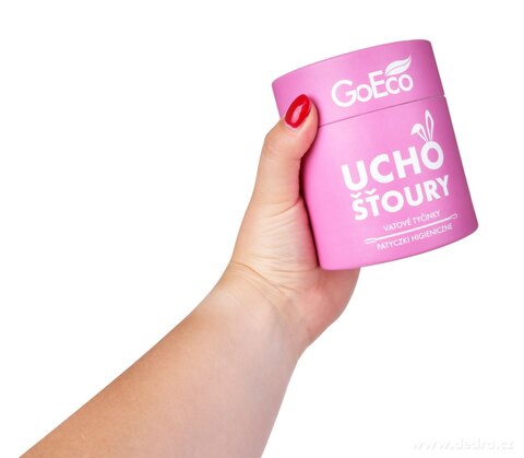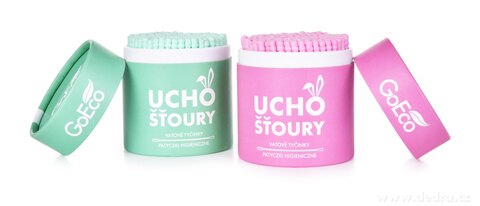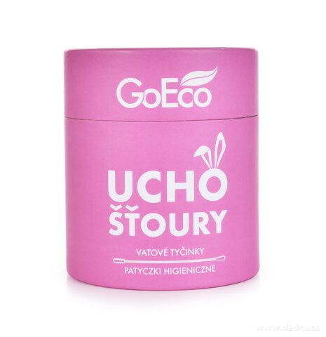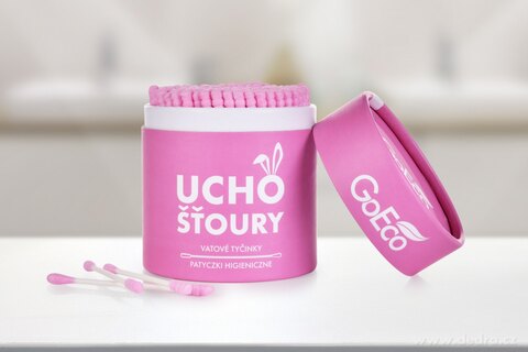 Ekologické vatové tyčinky UCHOŠŤOURY (200 ks) s pevnou kartonovou tyčinkou z recyklovaného papíru a 100% bavlnou. Růžová varianta v EKO obalu, dva tvary konců pro hygienu i kosmetiku.