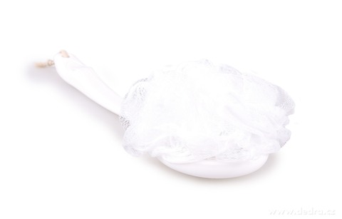 SPA puff houba na mytí zad s dlouhou rukojetí 38 cm v bílé barvě. Síťovinová houba vytváří bohatou pěnu, masíruje a čistí pokožku. Praktická pro každodenní sprchu i relaxační koupel.