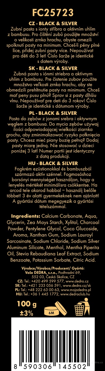 DEDRA DENT® BLACK & SILVER přináší inovativní péči o zuby a dásně v přírodní formuli bez zbytečné chemie. Kombinace iontů stříbra a aktivního bambusového uhlí poskytuje antibakteriální ochranu, napomáhá regeneraci dutiny ústní a při pravidelném používání šetrně obnovuje přirozenou bělost zubů.