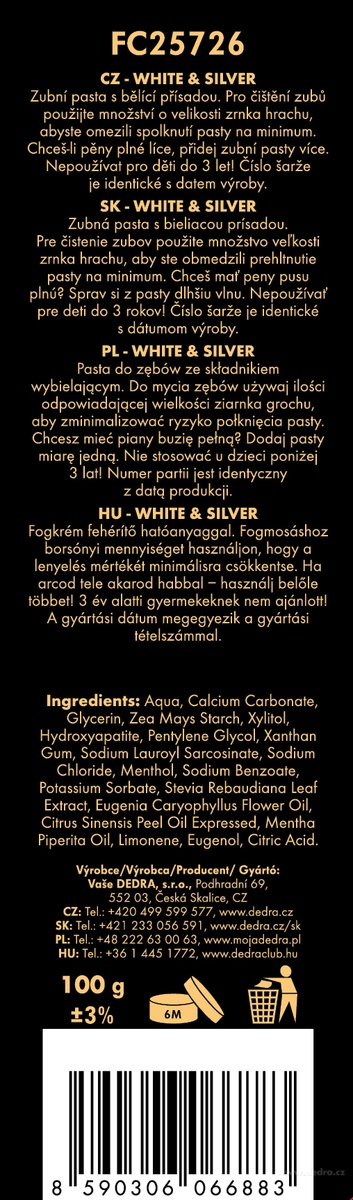 DEDRA DENT® WHITE & SILVER je luxusní přírodní bělící zubní pasta vyvinutá pro každodenní šetrnou péči o zuby a dásně. Díky unikátní složce Omyadent® s přírodním hydroxyapatitem a kalcium karbonátem obnovuje přirozenou remineralizaci skloviny a posiluje její odolnost. Jemná bělící báze z vápence šetrně odstraňuje pigmentace a nečistoty, aniž by poškozovala sklovinu.