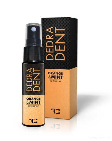 Přírodní ústní sprej DEDRA DENT® ORANGE & MINT s pomerančovým olejem, mátou, hřebíčkem a mentolem. Slazený xylitolem a stévií, bez cukru a chemických konzervantů. Okamžitě osvěžuje dech a působí antibakteriálně.