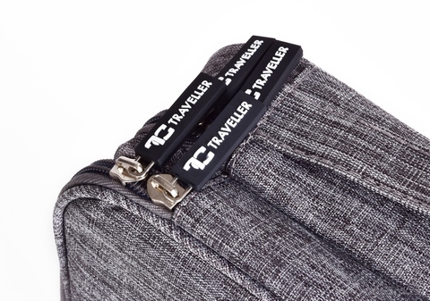 Prostorné 2patrové pouzdro na elektroniku FC TRAVELLER z šedé melange textilie. Nabízí síťované kapsy, pružná poutka a polstrovanou přihrádku na tablet. Ideální na kabely, nabíječky, powerbanky a příslušenství.