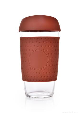 Skleněný kelímek na kávu 500 ml z borosilikátového skla s odnímatelným silikonovým víčkem a manžetou. Stylová alternativa jednorázových kelímků – vhodný do myčky, mikrovlnky i ledničky.