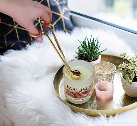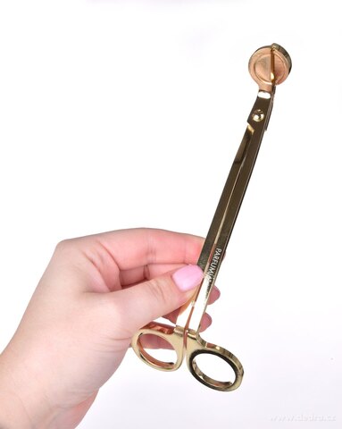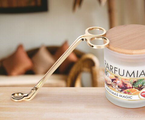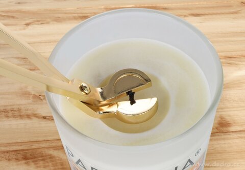 Zlaté nůžky na knot PARFUMIA® z nerezové oceli s elegantním designem. Zahnutý tvar umožňuje snadné zastřižení knotu i u svíček ve skle. Pro čisté hoření a delší životnost svíčky. Dodáváno v sametovém sáčku.