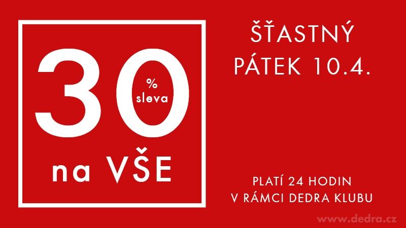 Pouze dnes máte jedinečnou příležitost využít 30% slevu na vše na www.dedra.cz! 🛍️ Sleva platí od 10.4.2026 od 9:00 až do soboty 11.4.2026 do 9:00 hodin ráno. Tato nabídka je určena pouze registrovaným členům DEDRA KLUBU.
