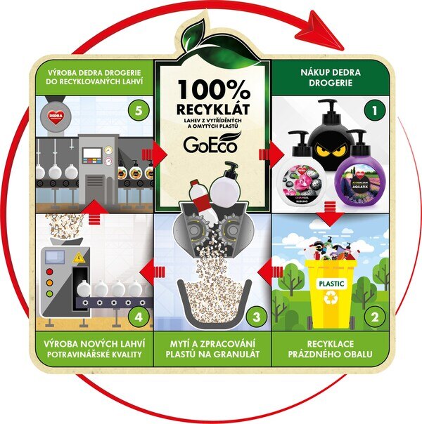 Na výrobu plastových lahví GoEco používáme použité, vytříděné ♻️ a omyté plasty potravinářské kvality (food grade). Tím pádem nepotřebujeme nové "panenské" plasty z ropy pro výrobu obalů na naše ekologicky šetrné výrobky drogerie a kosmetiky. Cirkulární systém využití plastů ♻️
