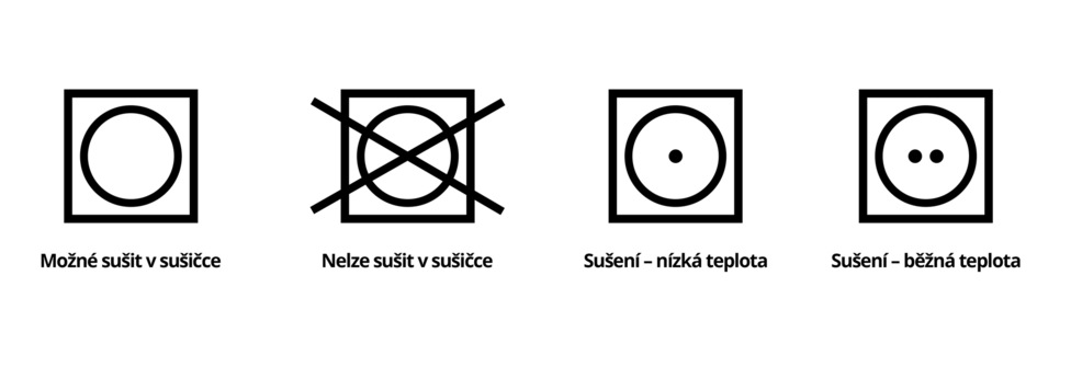 Na oblečení můžeme najít tyto symboly pro sušení prádla v sušičce: