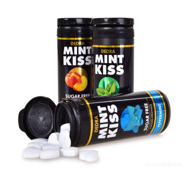 Mátové osvěžující pastilky bez cukru MINT KISS 28 g ve svěžích příchutích PEPPERMINT, SPEARMINT, PEACH MINT.