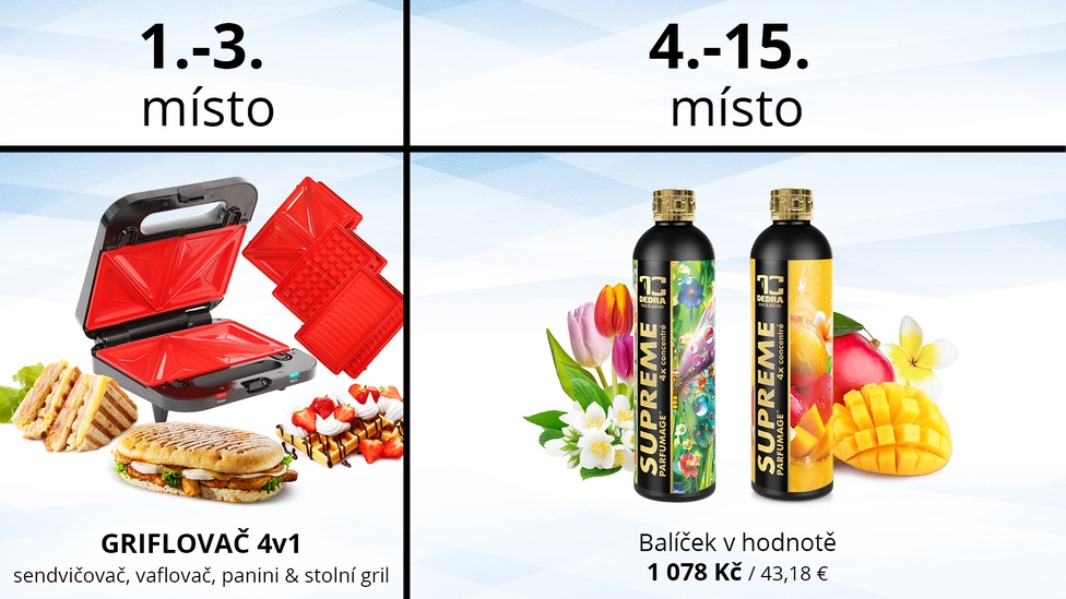 4. až 15. pozice získá.......balíček 2 ks PARFUMAGE SUPREME v hodnotě 1078 Kč/43,18 € (každý výherce na 4.-15. místě získá ceny uvedené na následujícím obrázku).