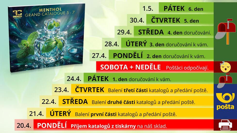 Od úterý 21.4. byly tedy katalogy postupně podávány a následně rozesílány prostřednictvím České a Slovenské pošty. Katalog ZDARMA posíláme zákazníkům, kteří měli alespoň jednu objednávku v období od 1.3.2026 do 7.4.2026.