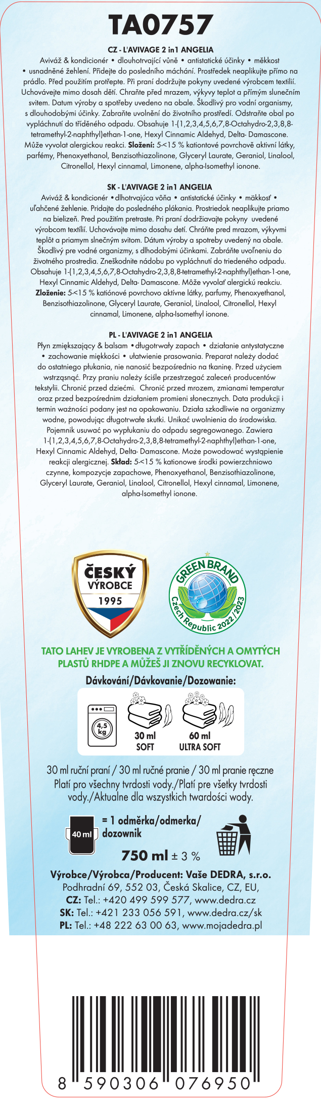 Avivážní kondicionér L’AVIVAGE 2in1 je DVOUSLOŽKOVÝ antistatický, změkčovací a parfemovaný prostředek, který se přidává do posledního máchání v pračce nebo při ručním praní. 750 ml odpovídá 4,5 l běžné aviváže.