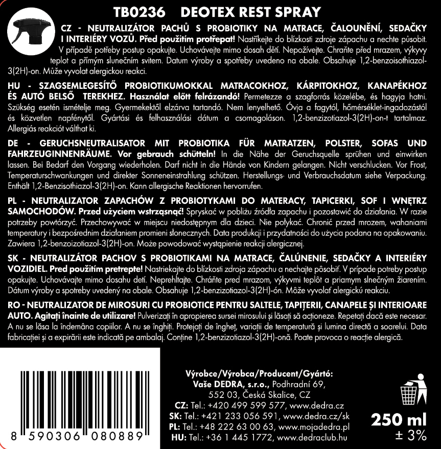 Neutralizér pachů s probiotiky DEOTEX® REST účinně odstraňuje nepříjemné pachy z matrací, čalounění, sedaček a interiérů aut. Osvěžuje textilie, eliminuje pach potu, vlhkosti i kouře. Probiotika přirozeně rozkládají zdroj zápachu a zanechávají prostředí čisté, svěží a příjemně voňavé.