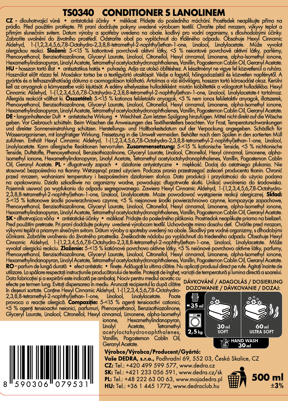 LANOLINO conditioner s lanolinem je šetrný kondicionér na vlněné a jemné prádlo. Zjemňuje vlákna, obnovuje jejich pružnost a chrání je před vysušením. Neutralizuje elektrostatický náboj, usnadňuje žehlení a zanechává prádlo hebké, voňavé a svěží po každém praní.